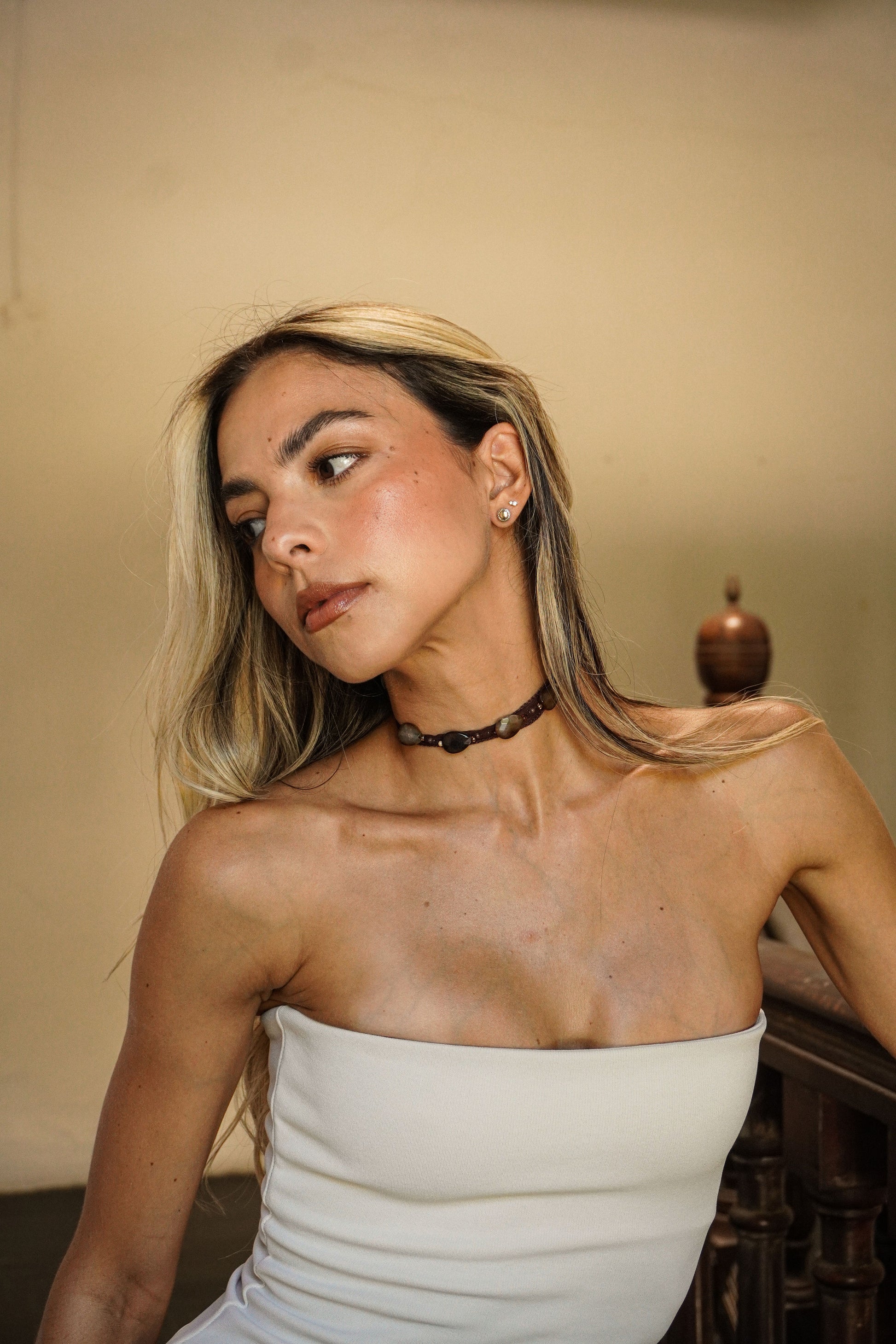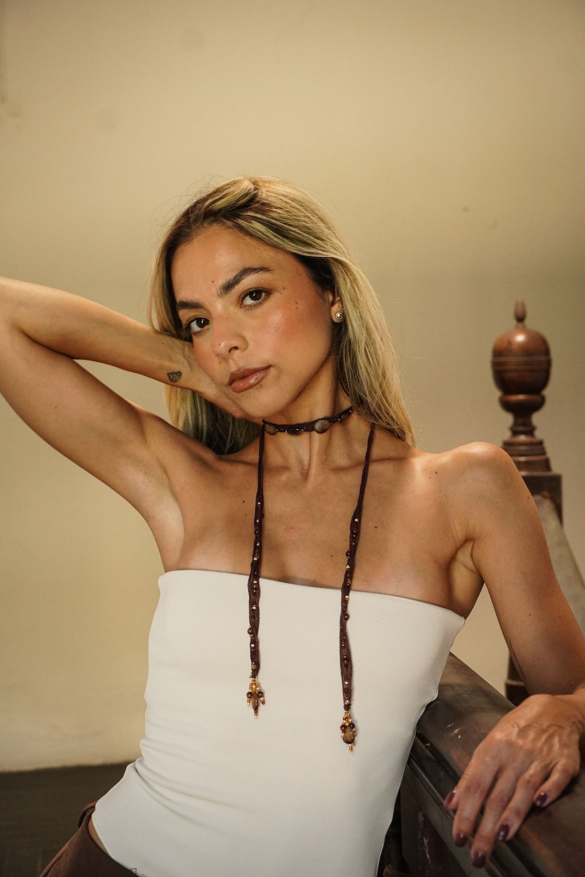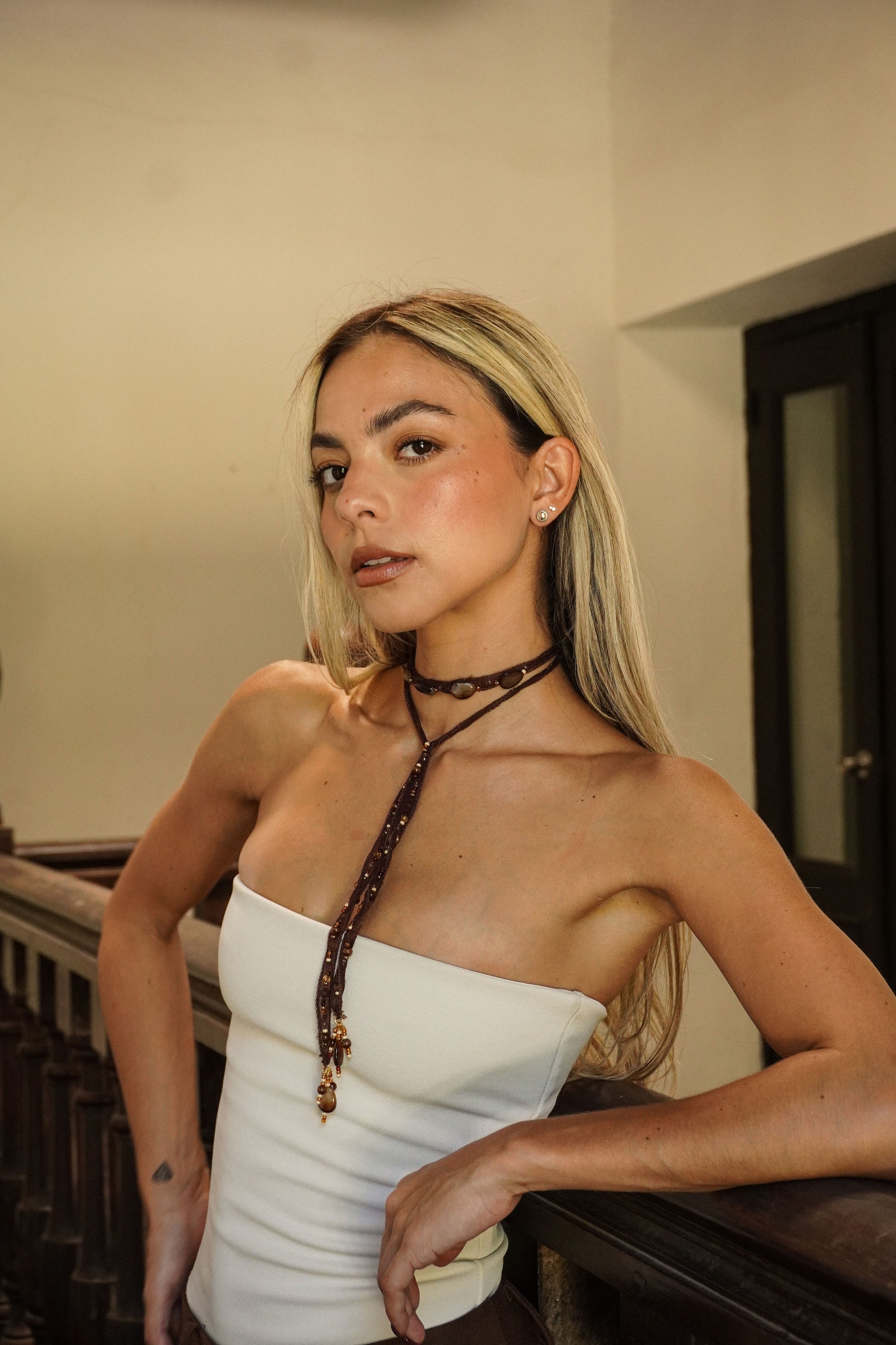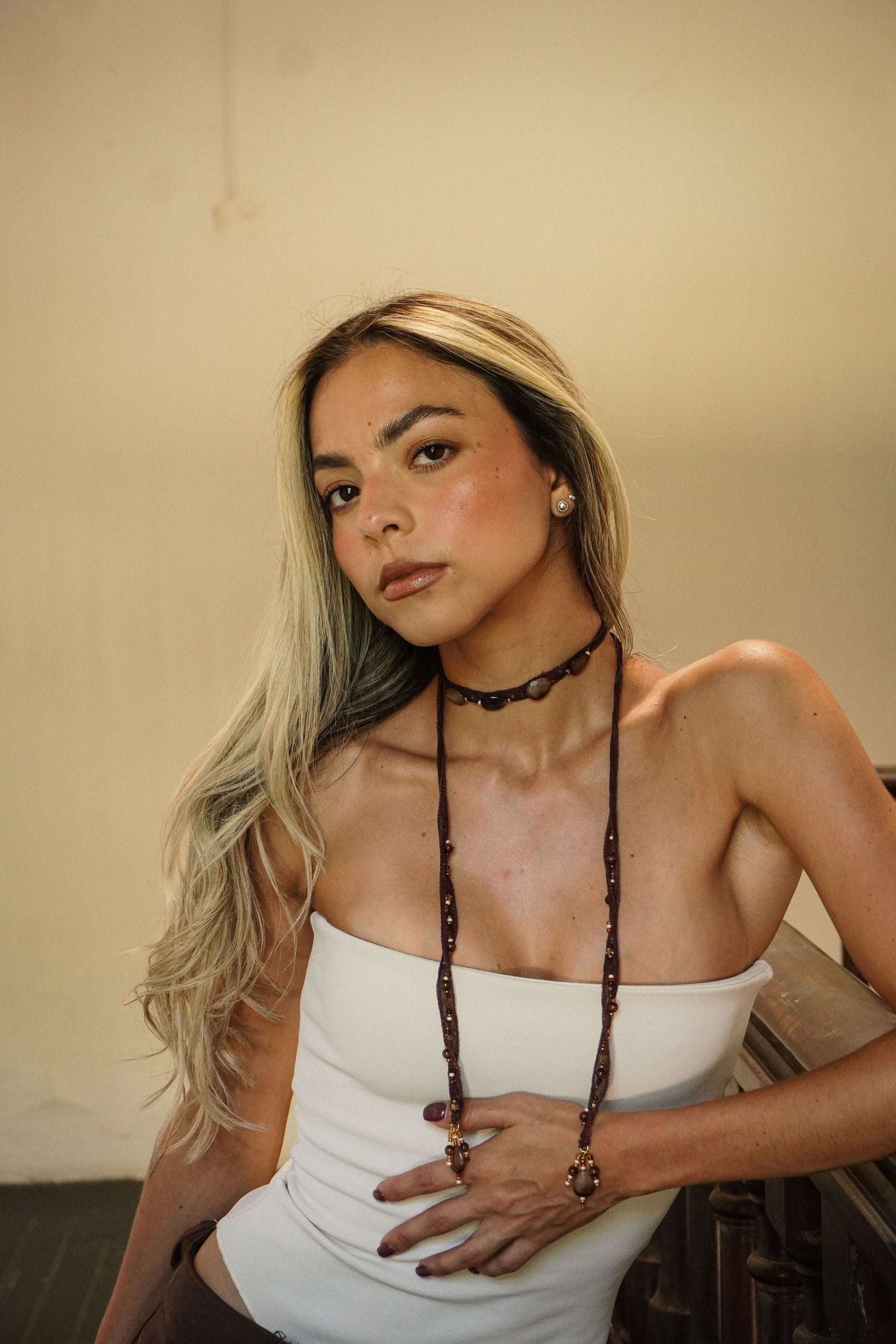 Crafted with brown silk thread and smooth earth-toned stones